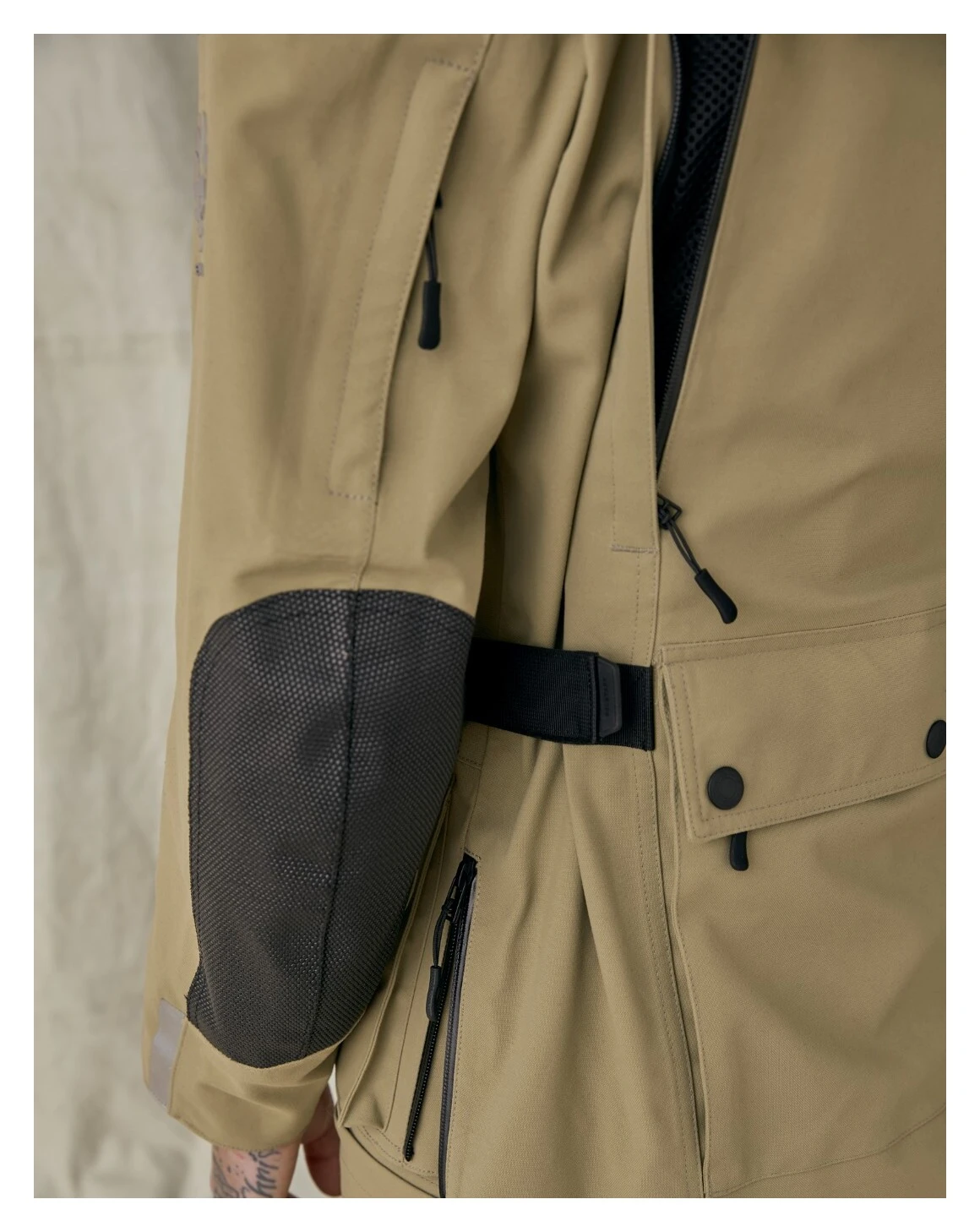 Belstaff takes a bold step into the modern era with the Long Way Up Gore-Tex Adventure Jacket. The jacket starts with a waterproof yet breathable shell of Gore-Tex Pro three layer laminated fabric. Shoulders and elbows are reinforced with Superfabric overlays that are discretely shaped and packaged like traditional shoulder and elbow wear panels. Neoprene lines the collar, and a supplemental storm collar is included to completely lock-out rain if the skies happen to break. For high effort ADV maneuvers, intake vents at the chest are paired with exhaust vents at the triceps and back panel for steady airflow at low speeds. All exterior vents, the main closure and two interior pockets feature waterproof YKK zippers. There’s even a hidden stash pocket for safe storage of an extra passport or two.
